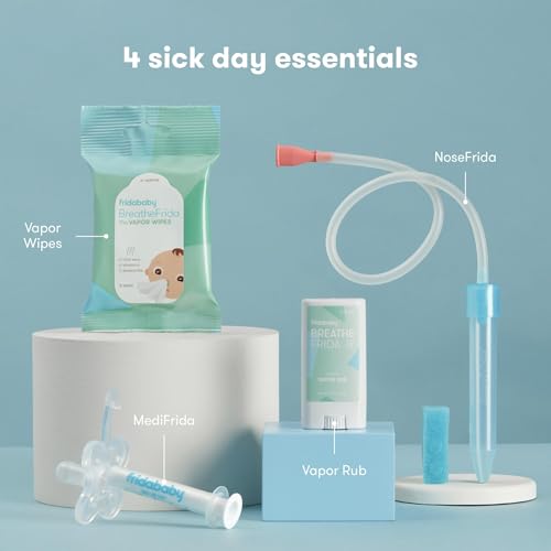 Frida Baby Sick Day Prep Kit, 4pc Set, Essentials Includes NoseFrida Nasal Aspirator, MediFrida Pacifier Medicine Dispenser, Breathefrida Vapor Chest Rub + Snot Wipes, Soothe Stuffy Noses for Babies